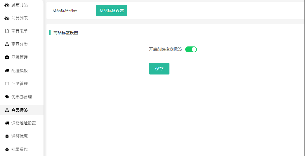 可选择开启前端搜索标签,在搜索页面可以通过标签搜索商品,没有开启则无法搜索